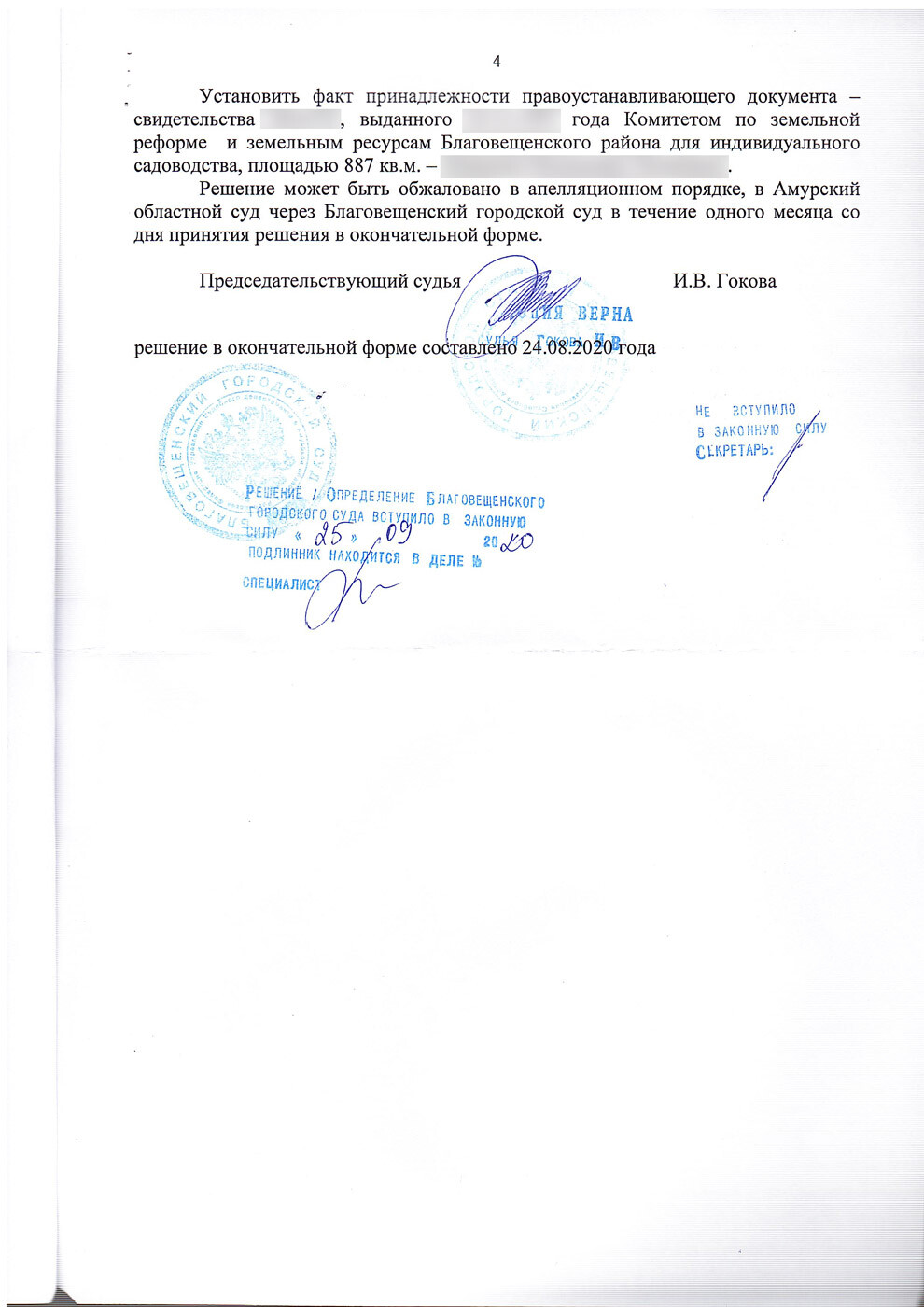 Выписка из решения суда: Установить факт принадлежности правоустанавливающего документа – свидетельства о праве собственности на землю № …………….. дата выдачи ……………..