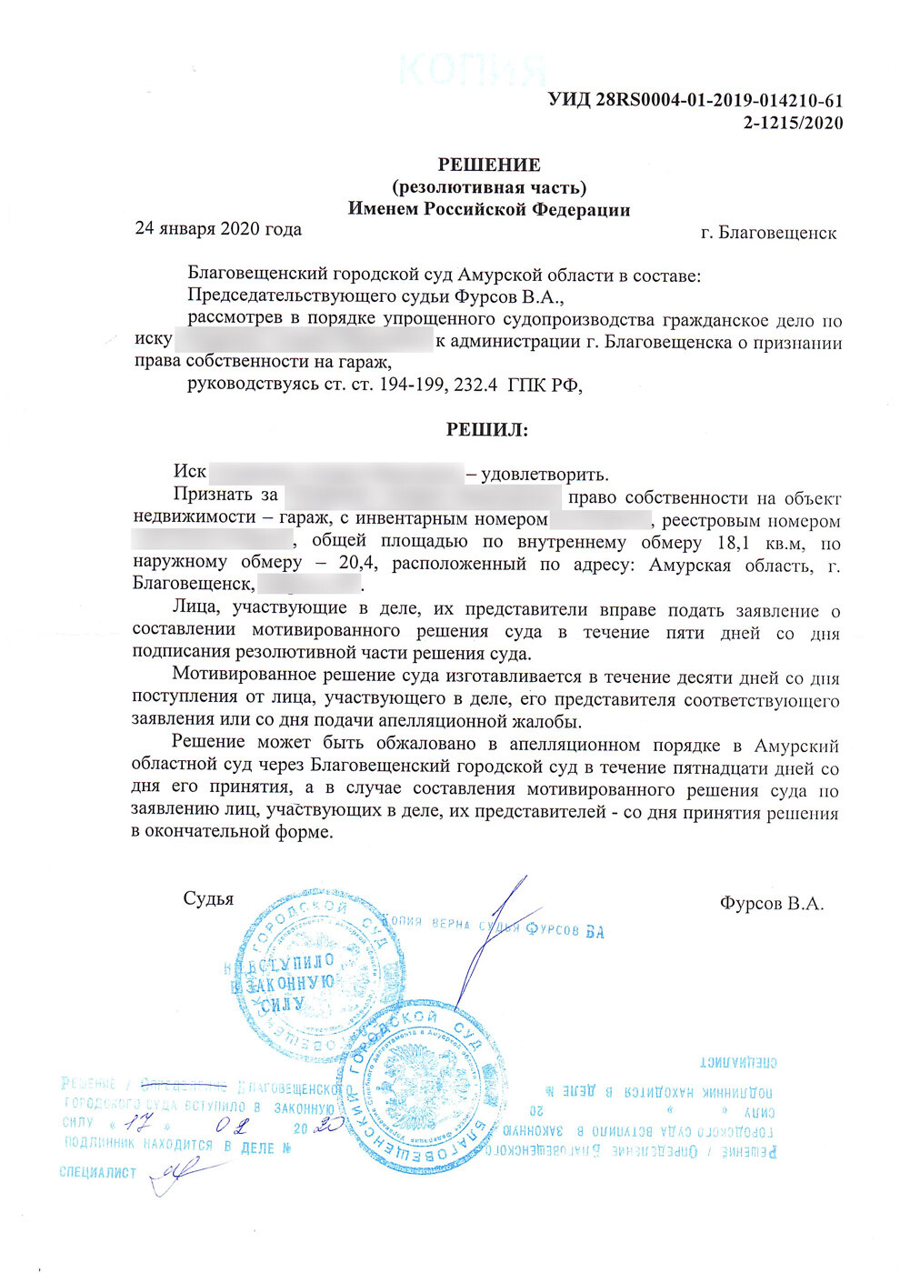Выписка из решения суда: Признать за …………….. право собственности на объект недвижимости – гараж, с инвентарным номером …………….., реестровым номером …………….. общей площадью …………….., расположенный по адресу: ……………..