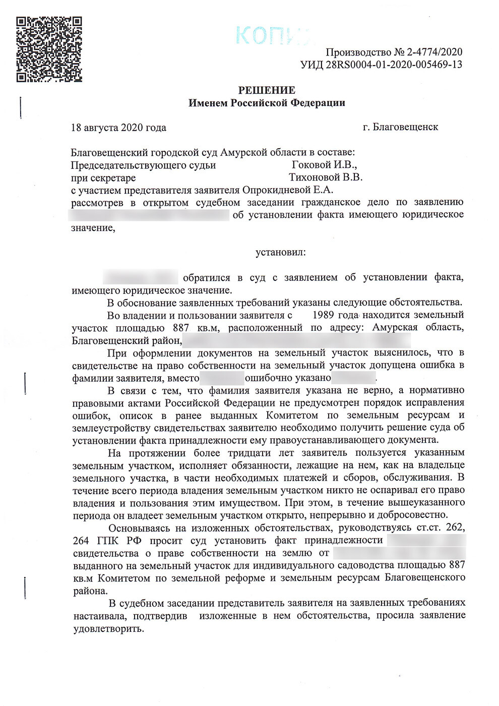 Ситуация: В свидетельстве о праве собственности на землю, выданном в 1993 году, допущена ошибка в фамилии собственника. Организации, которая выдала документ с ошибкой, уже не существует, исправление ошибки в досудебном порядке не возможно. Так как в документе имеются не соответствия, клиент не может зарегистрировать право на участок в упрощенном порядке, в связи с чем он обратился за юридической помощью в ООО «Земельно-правовой центр»